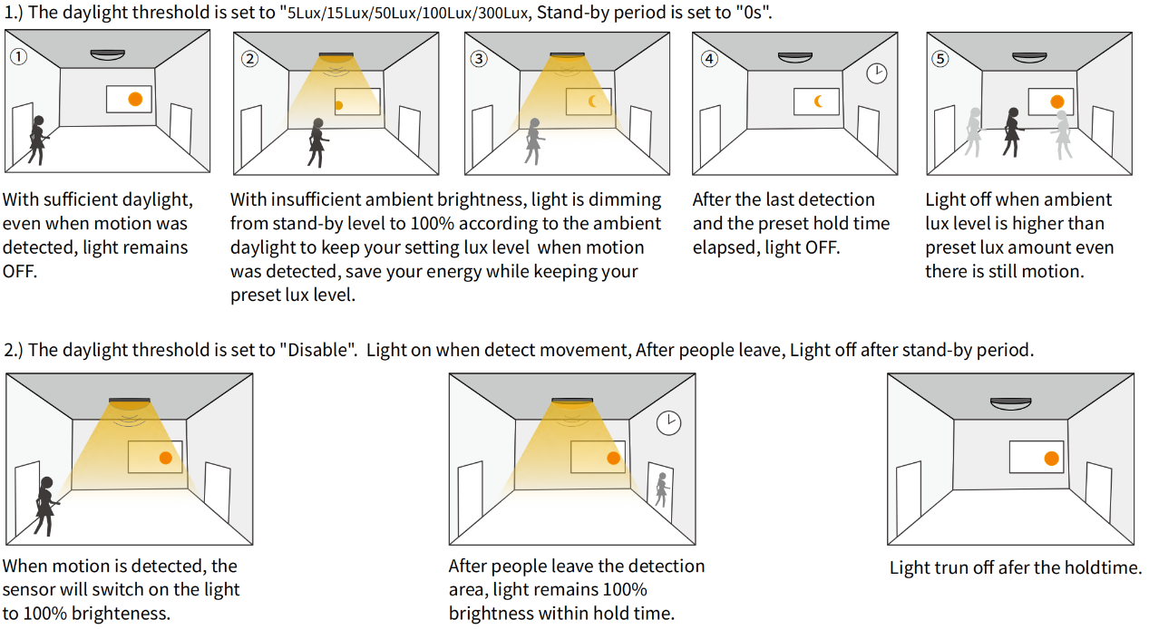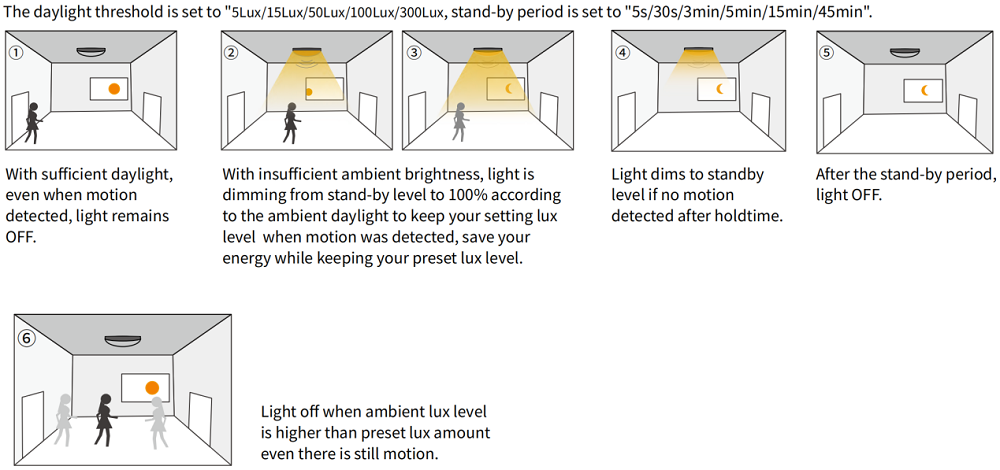 Благодарение на технологията dual-PD, сензорът MC004-S02R може да направи разликата между естествена и изкуствена LED светлина. Сензорът ще включи вашите осветителни тела, когато околната светлина е по-ниска от стойността на настройката, дори да не се засече движение. Когато околната светлина достигне зададената стойност, сензорът ще изключи осветителните тела, дори ако все още има движение.
