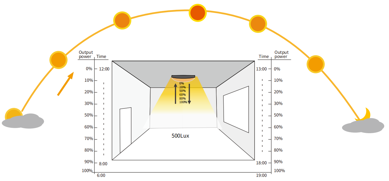 Когато сензорът открие естествената светлина, той ще затъмни светлината, осветителното тяло затъмнява изхода, както е показано по-долу: