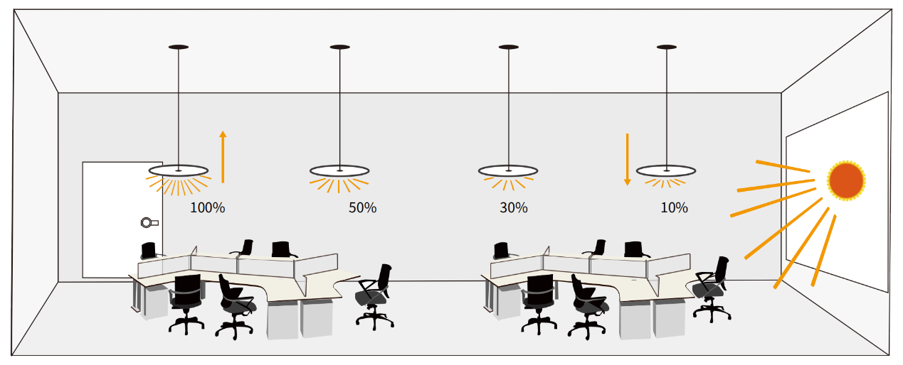 Събиране на дневна светлина - Автоматично усеща интензитета на околната светлина и динамично регулира яркостта на лампите, за да оптимизира консумацията на енергия;
