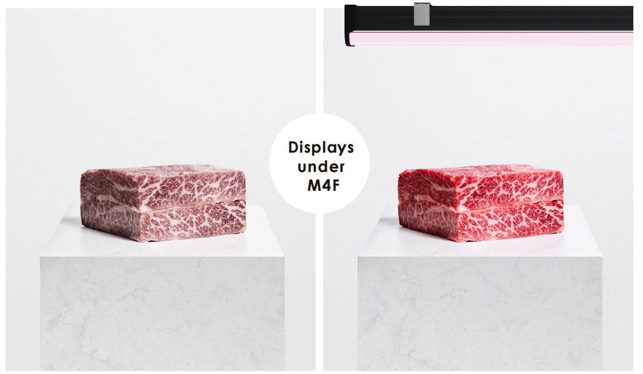 Базиран на M4 ултратънка лентова светлина,Fanxstarнаправи корекция на източника на светлина, за да направи спектър 4000K+6500K+червено 660nm специално за отдела за месо в супермаркетите. Под светлината на този светлинен спектър за месо, месото, което продаваме в супермаркетите, може да изглежда по-сочно и свежо, като по този начин увеличава продажбите на месо.